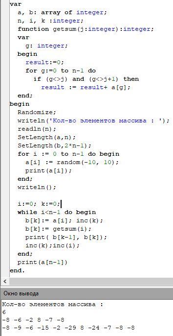Дан массив, содержащий N (1≤N≤1000) целых элементов. Напишите программу, которая вставляет между каждыми двумя элементами сумму остальных элементов (например, массив -1,2,5,0,2 станет -1,7,2,1,5,3,0,6,2)