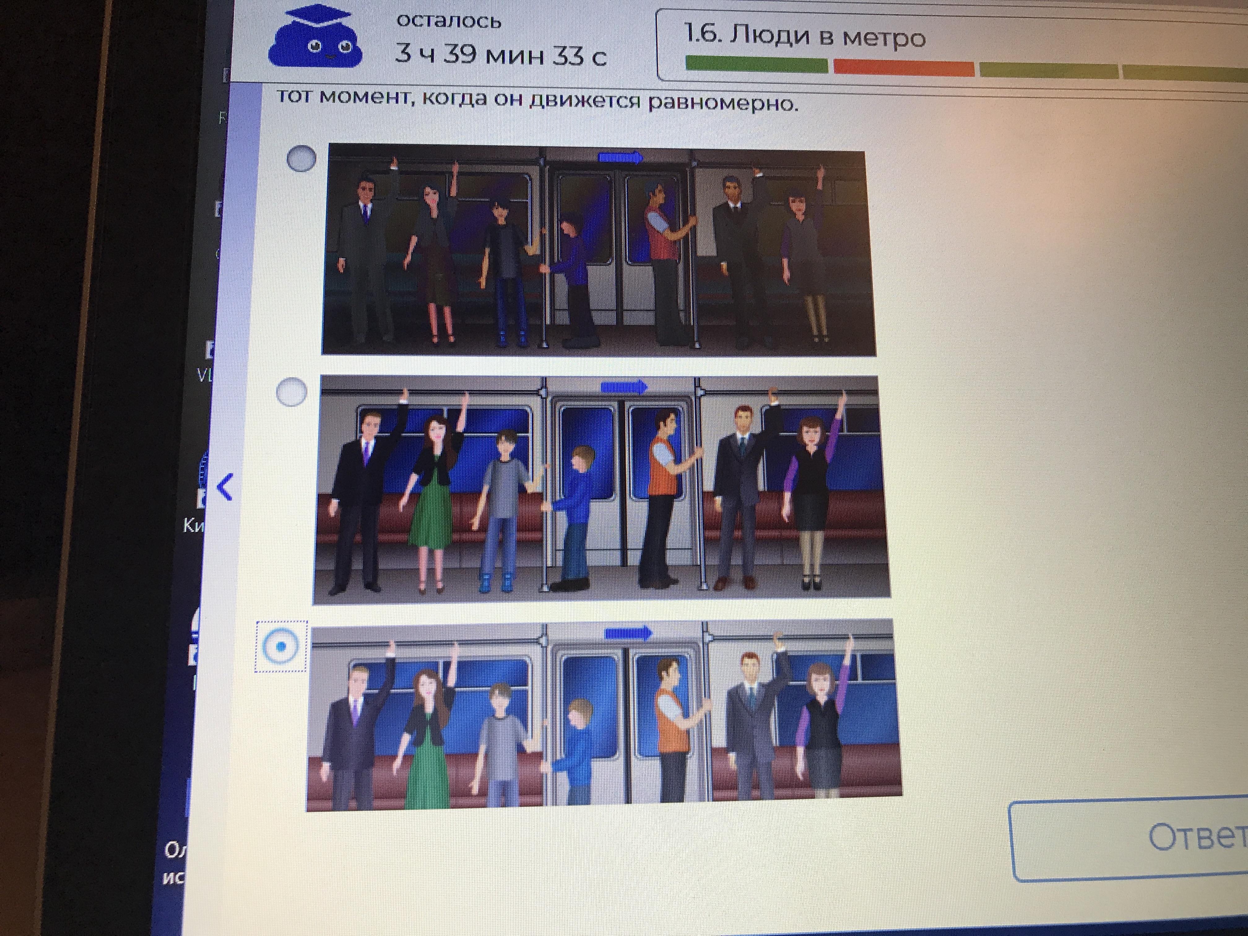 При поездке в метро люди наклоняются то по ходу движения вагона, то против него. определите, на каком из рисунков вагон метро изображен в тот момент, когда он движется равномерно. ПОМОГИТЕ