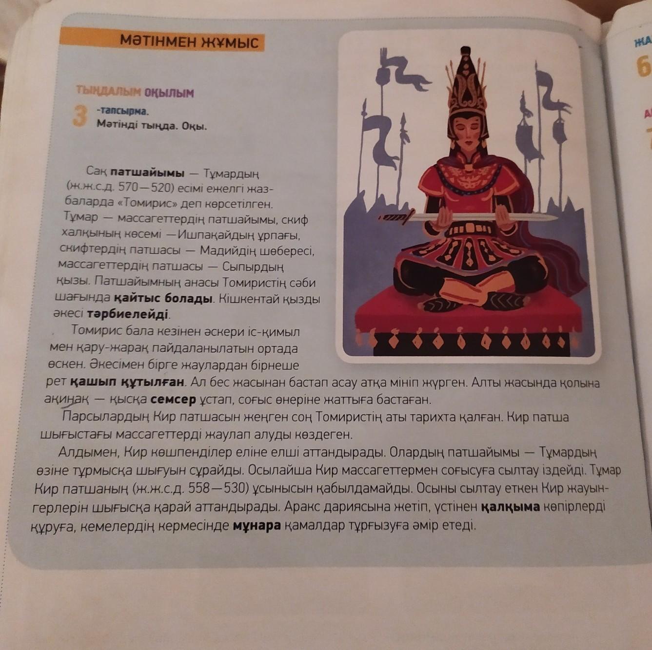 ТЫҢДАЛЫМ ОҚЫЛЫМ 3 -тапсырма. сделать вопросы по тексту (три вопроса) Мәтінді тыңда. Оқы. In Onli Сақ патшайымы Тұмардың (ж.ж.с.д. 570—520) есімі ежелгі жаз- баларда «Томирис» деп көрсетілген. Тұмар 12 массагеттердің патшайымы, Скиф халқының көсемі — Ишпақайдың ұрпағы, Скифтердің патшасы - Мадийдің шөбересі, массагеттердің патшасы — - Сыпырдың Қызы. Патшайымның анасы Томиристің сәби шағында қайтыс болады. Кішкентай қызды әкесі тәрбиелейді. Томирис бала кезінен әскери іс-қимыл мен қару-жарақ пайдаланылатын ортада өскен. Әкесімен бірге жаулардан бірнеше рет қашып құтылған. Ал бес жасынан бастап асау атқа мініп жүрген. Алты жасында қолына ақинақ — қысқа семсер ұстап, соғыс өнеріне жаттыға бастаған. Парсылардың Кир патшасын жеңген соң Томиристің аты тарихта қалған. Кир патша Шығыстағы массагеттерді жаулап алуды көздеген. Алдымен, Кир кешпенділер еліне елші аттандырады. Олардың патшайымы — Тұмардың өзіне тұрмысқа шығуын сұрайды. Осылайша Кир массагеттермен соғысуға сылтау іздейді. Тұмар Кир патшаның (ж.ж.с.д. 558—530) ұсынысын қабылдамайды. Осыны сылтау еткен Кир жауын- герлерін шығысқа қарай аттандырады. Аракс дариясына жетіп, үстінен қалқыма көпірлерді құруға, кемелердің кермесінде мұнара қамалдар тұрғызуға әмір етеді.