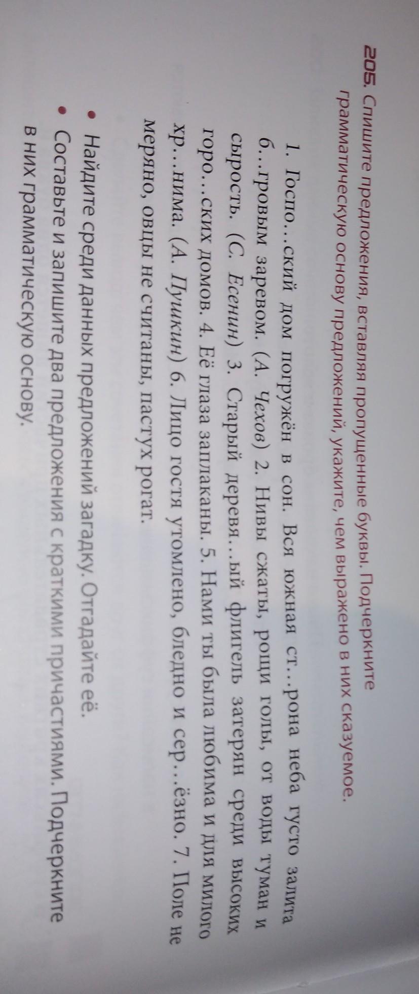 1. Господский дом(подлежащее) погружен(сказуемое выраженно кратким причастием) в сон. Вся южная сторона(подлежащее) неба густа залита(сказуемое, краткое причастие) багровым заревом. 2. Нивы(подлежащее) сжаты(сказуемое, краткое причастие), рощи(подлежащее) голы(сказуемое, краткое причастие), от воды туман и сырость. 3. Старый деревянный флигель(подлежащее) затерян(сказуемое, краткое причастие) среди высоких городских домов. 4. Её глаза(подлежащее) заплаканы. 5. Нами ты(подлежащее) была любима(составное сказуемое, была - глагол, любима - краткое причастие, хранима - краткое причастие) и для милого хранима. 6. Лицо(подлежащее) гостя утомлено, бледно и серьезно(сказуемое, краткое причастие, утомлено, бледно, серьезно). 7. Поле(подлежащее) не меряно(сказуемое, краткое причастие), овцы(подлежащее) не считаны(сказуемое, краткое причастие), пастух(подлежащее) рогат(сказуемое, краткое причастие).
