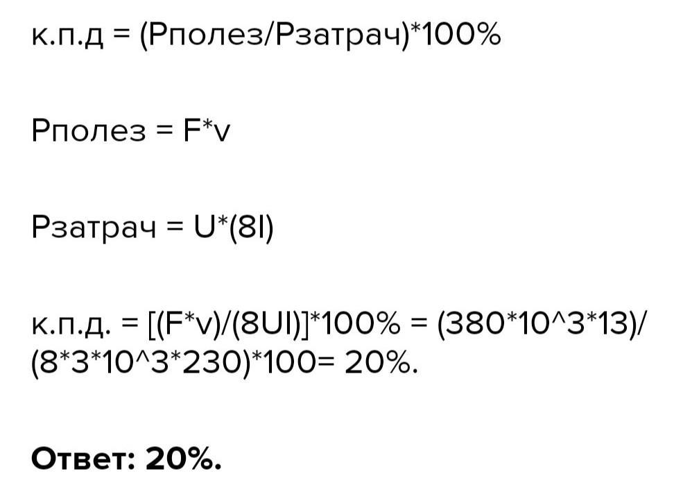 Срочно !, помогите, даю 60 баллов. Сила тяги электровоза при скорости 13 м/с составляет 380 кН. Определить КПД электровоза если напряжение контактной сети составляет 3 кВ и сила тока в обмотке каждого с восьми двигателей равняется 230 А.