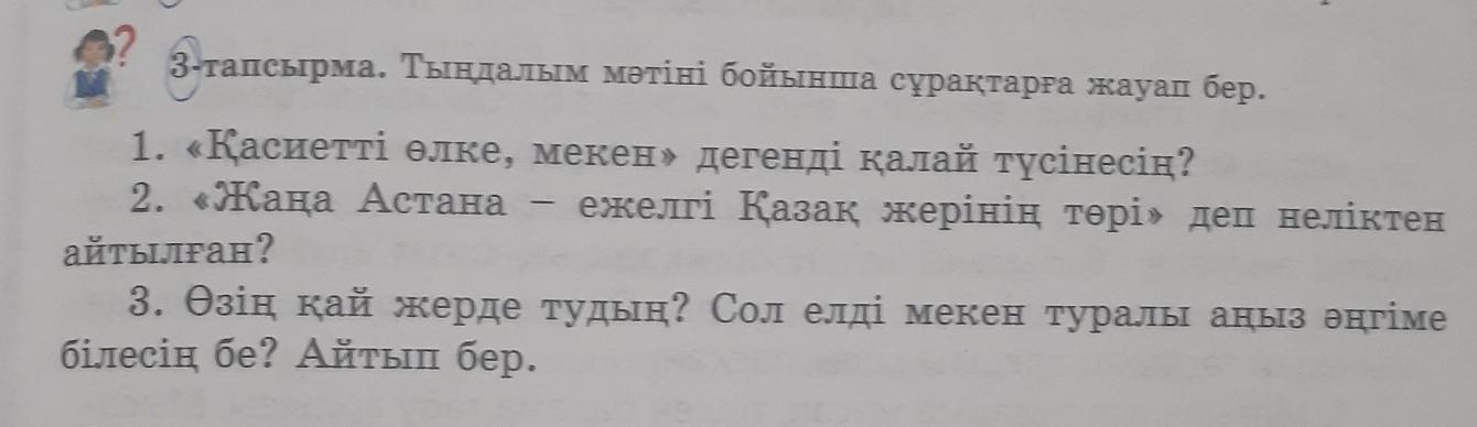 3-тапсырма. Тыңдалым мәтіні бойынша сұрақтарға жауап бер. 1. «Қасиетті өлке, мекен» дегенді қалай түсінесің? ежелгі Қазақ жерінің төрі» деп неліктен 2. «Жаңа Астана айтылған? 3. Өзің қай жерде тудың? Сол елді мекен туралы аңыз әңгіме білесің бе? Айтып бер.(комек, и потом дұрстап жазндарш зайбал!)
