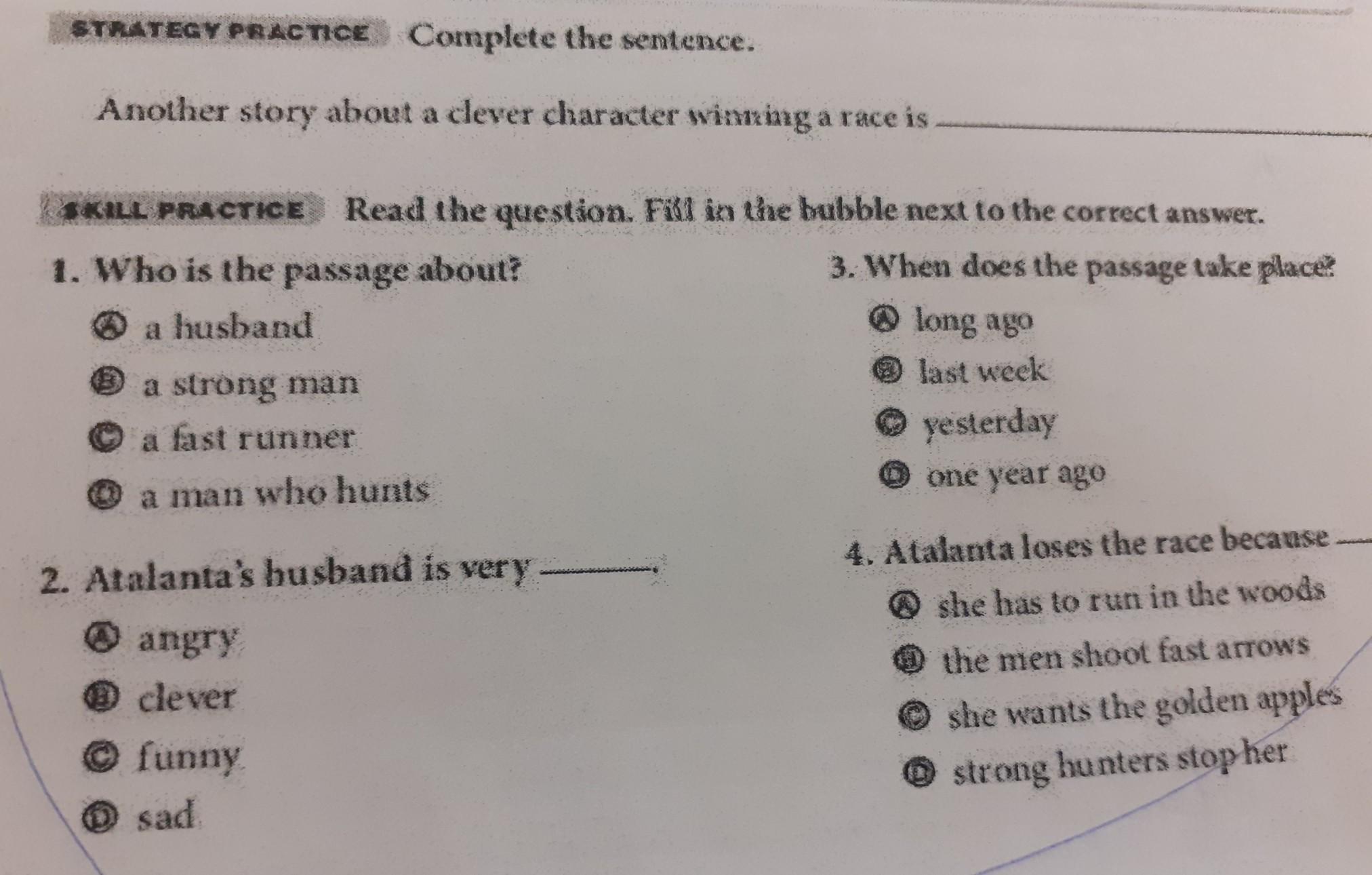 Long ago and far away, there lived a princess named Atalanta. She was very beautiful. She was very strong, too. Atalanta loved to run. She could run fast. She could run faster than the men! When men asked Atalanta to marry them, she said no. She liked to be free. She liked to hunt and spend time in the woods. One day, Atalanta said that she would marry any man who could run faster than her. When the big race began, Atalanta took off. She flew like an arrow. She was winning the race. One of the men in the race had a plan. He carried three apples made of gold. During the race, he threw the apples in Atalanta's path. Three times during the race, Atalanta stopped. She stopped to pick up a golden apple. The clever man ran past her. He won the race and became Atalanta's husband.