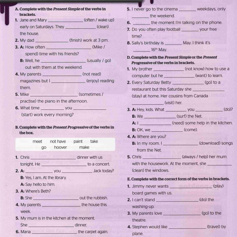 A. 1. often wake up, clean 3. finishes 4. don’t read, enjoy 5. sometimes practises 6. do you start