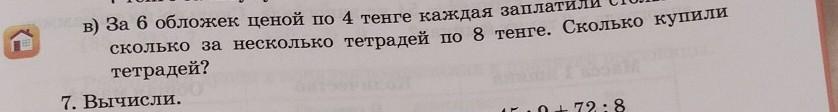 в) За 6 обложек ценой по 4 тенге каждая заплатили столько же, сколько за несколько тетрадей по 8 тенге. Сколько купили тетрадей?.