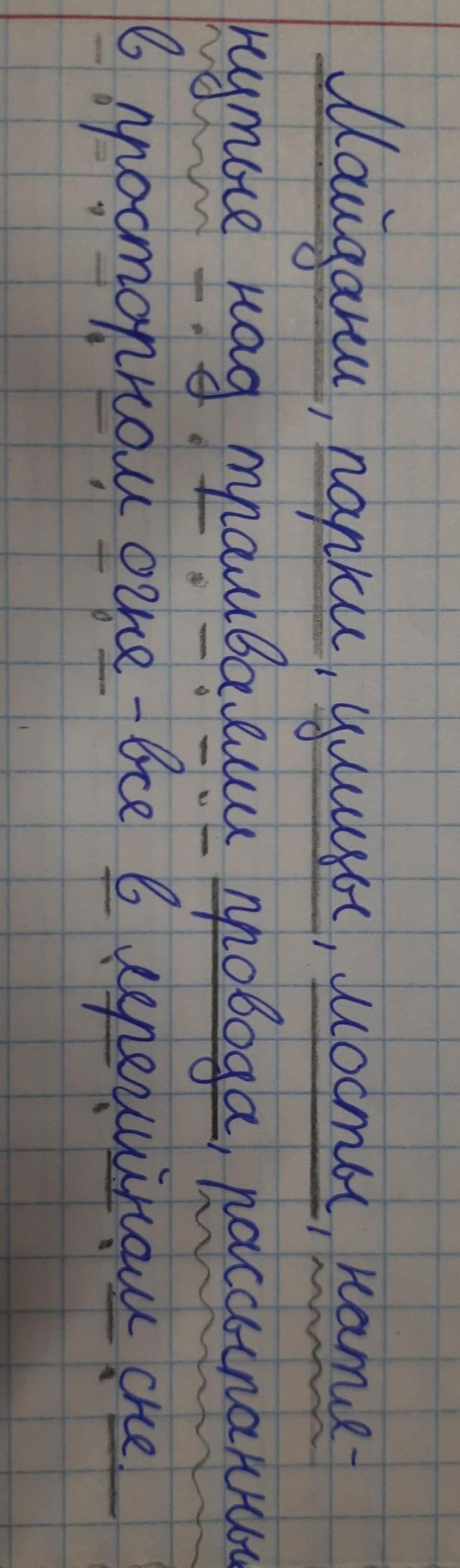 Майданы, парки, улицы, мосты, натянутые над трамваями провода, рассыпанные в просторном огне – все в лерегийном сне. Разберите по синтексическому разбору
