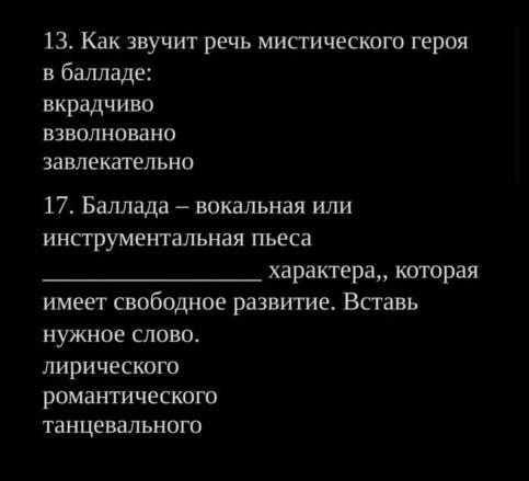 17. Баллада - вокальная или инструментальная пьеса романтического характера, которая имеет свободное развитие.