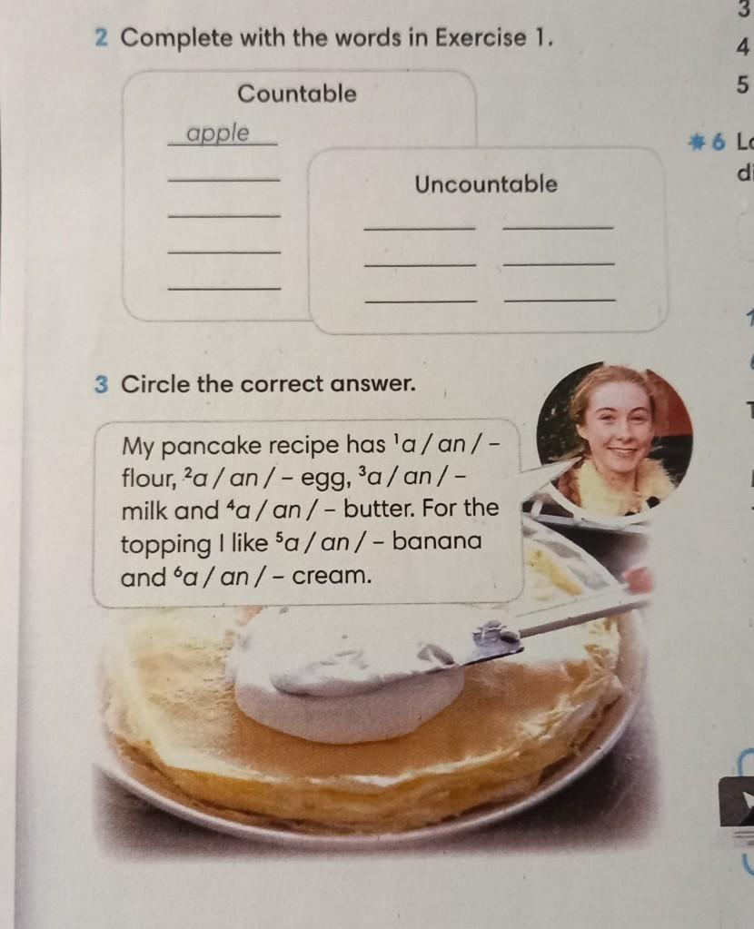 ex 3 a flour , an egg , milk and butter , banana and a cream