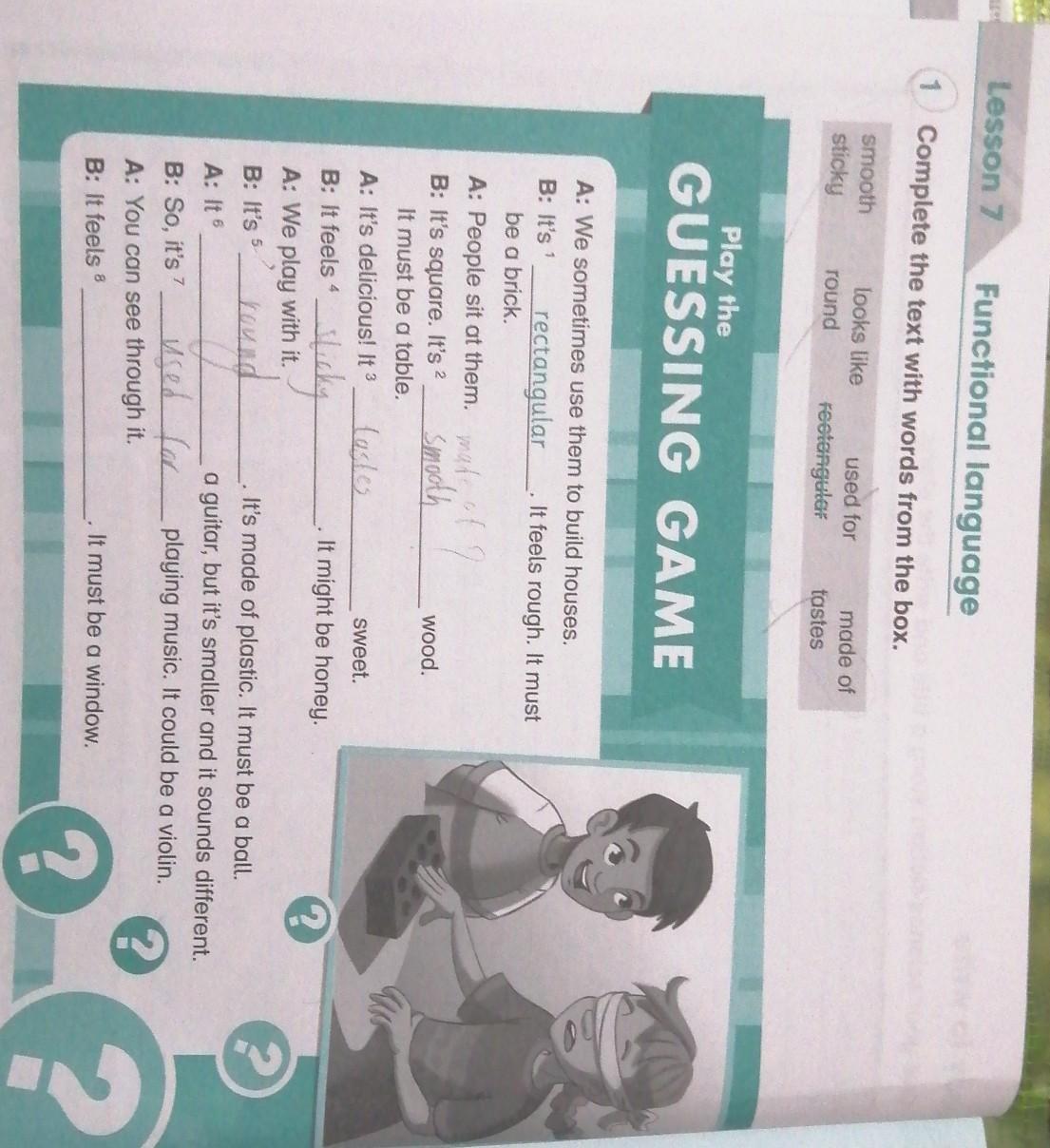 1 задания со словами smooth, looks like, used for, made of, sticky, round, tastes.