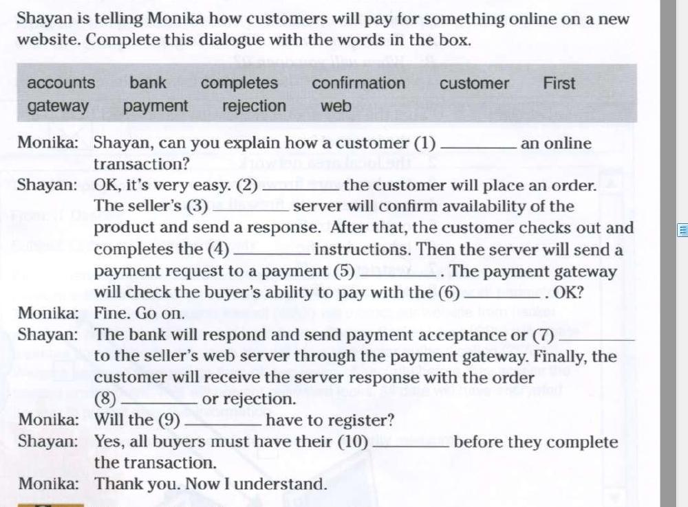 Shayan is telling Monika how customers will pay for something online on a new website. Complete this dialogue with the words in the box.