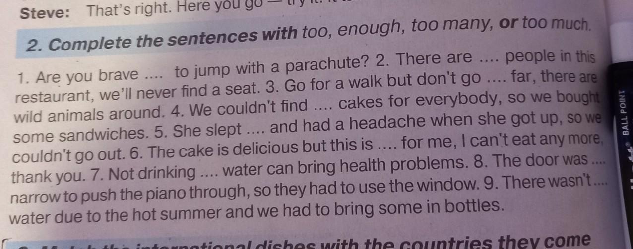2. Complete the sentences with too, enough, too many or too much 1. Are you brave .... to jump with a parachute? 2. There are people na restaurant, we'll never find a seat. 3. Go for a walk but don't go ... far, there a wild animals around. 4. We couldn't find .... cakes for everybody, so we bought some sandwiches. 5. She slept .... and had a headache when she got up. so couldn't go out. 6. The cake is delicious but this is .... for me, I can't eat any more thank you. 7. Not drinking .... water can bring health problems. 8. The door ves narrow to push the piano through, so they had to use the window. 9. There wasn't water due to the hot summer and we had to bring some in bottles