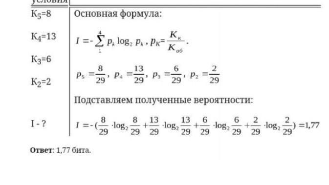 13 четверок, 6 троек и 2 двойки. Какое количество информации получил Васечкин при получении тетради с оценкой. Ответ 1.77 бита, нужно решение!