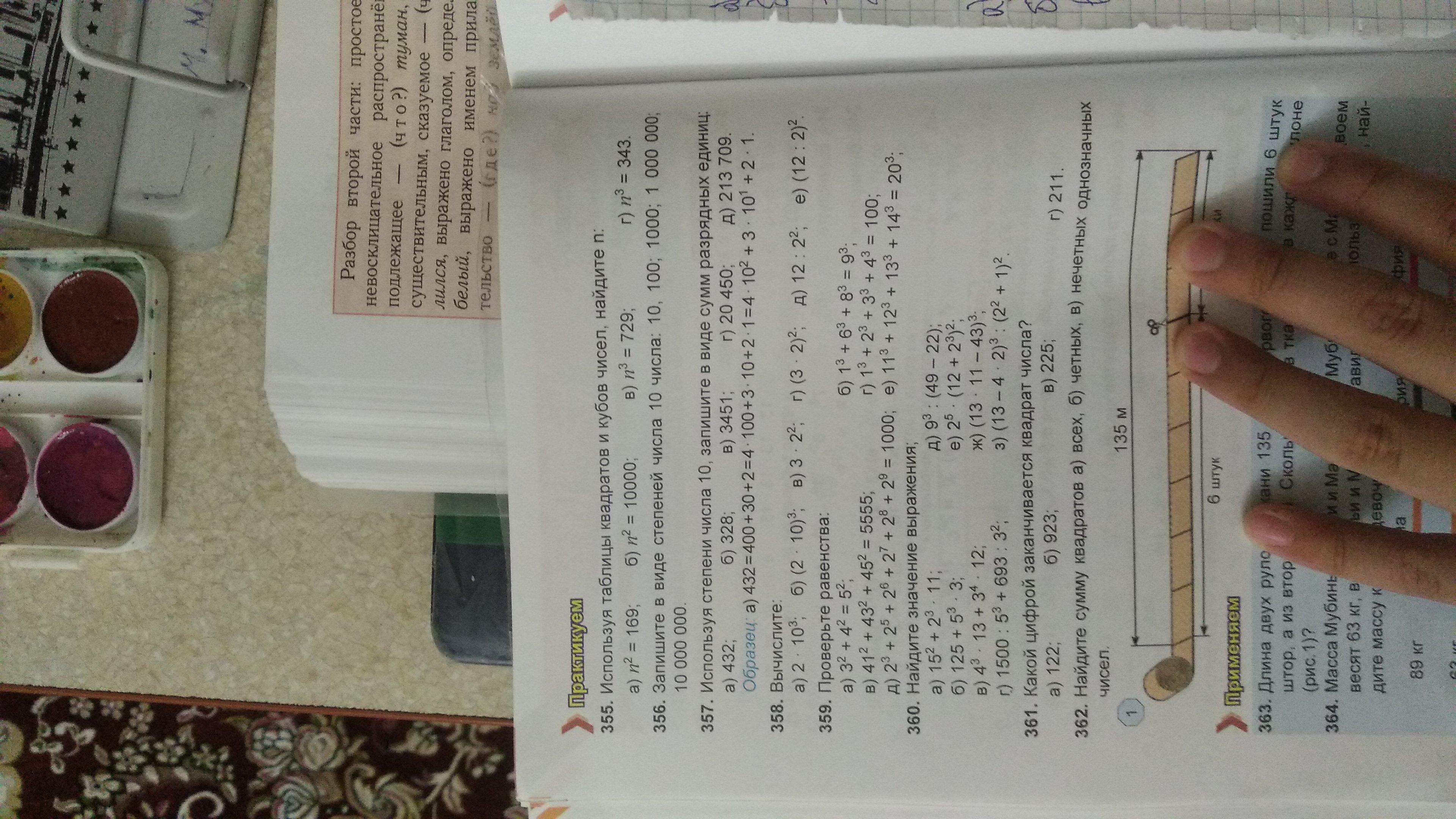 Математика 5 класс 358номер ответ: 1)2•10³=20•20•20=8000 2)(2•10)³=20•20•20=8000 3) 3•2²=6•6=36 (3•2)²=6•6=36