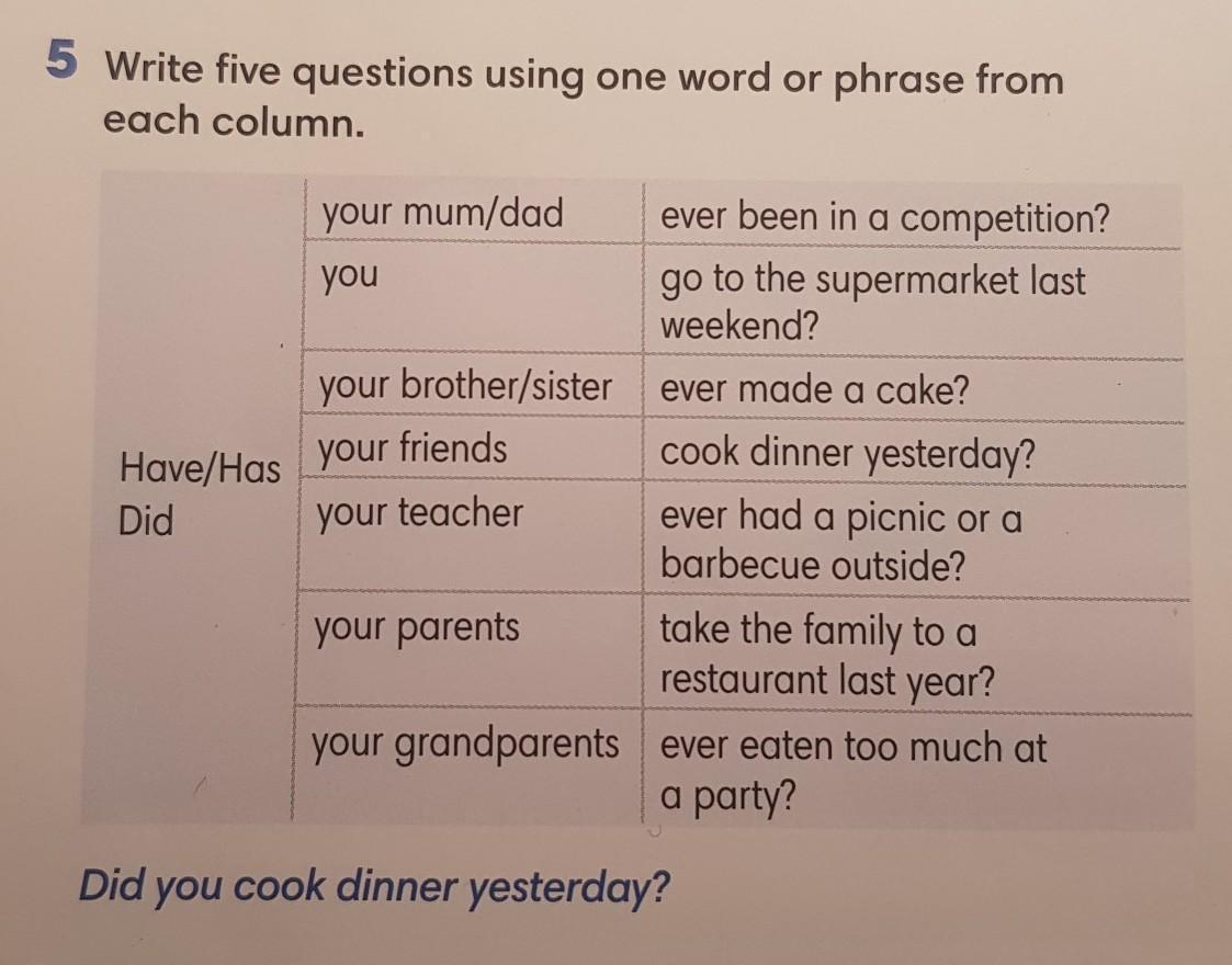 Напишите пять вопросов, используя по одному слову или фразе из каждого столбца.
