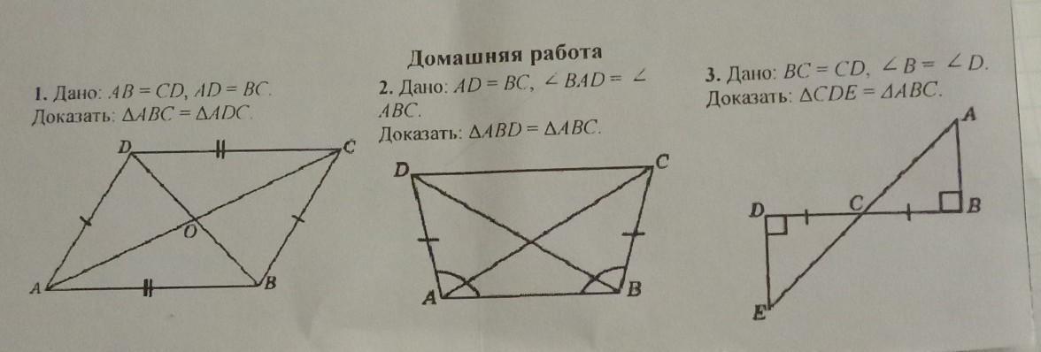 AD=BC, DC=AB(дано); угол D=углу B(по определению параллелограмма, следовательно по первому признаку равенства треугольников: треугольник ABC= треугольнику АDC
