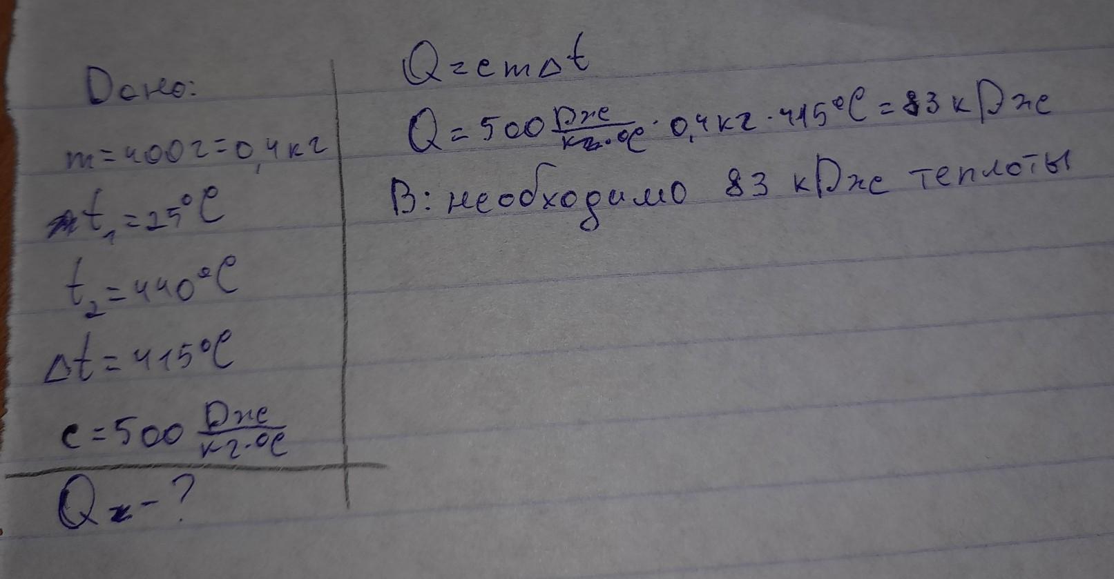 какое количество теплоты необходимо для нагревания стальной пластины (с=500 Дж/кг°с) массой 400г от 25°С до 440°С