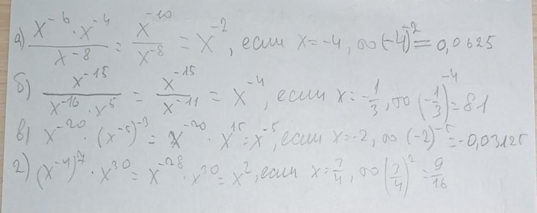 1) при умножении степени с одинаковыми основаниями показатели складываются. Что я и сделал под буквой а в числителе. х^(-6+(-4)=х^(-10). Это объяснить просто. Понятно же что х*х это х², тут мы сложили значения степеней(х¹*х¹=х^(1+1)). Или же перемножили х два раза. Нужно понимать что х³ можно представить как х*х*х, а х⁴ как х*х*х*х. Если перемнижить х³*х⁴, это тоже самое, что и х*х*х*х*х*х*х. Семь раз перемножили х.