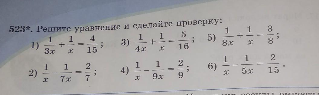 5 523*. Решите уравнение и сделайте проверку: 1) 3) 5) 1 1 + 8x х от го 1 1 ; + 1 1 + 4х х ; 16 Зх х 15 1 1 2 1 2 1 1 - 6) ого 5х 4) 15 1 2) х х 9x 7x 7