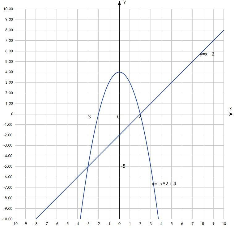 у = -х² + 4 - график парабола, ветви направлены вниз; у = х-2 - прямая.
