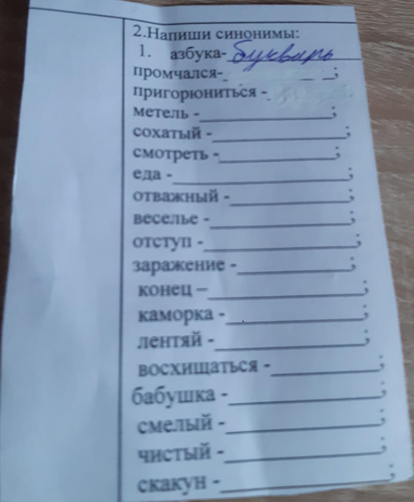 Напиши синонимы: 1. азбука- Прочался- пригорючиться - Метель - сохатый - смотреть - едa - Отважный веселье - отступ - заражение - Конец – каморка - лентяй - восхищаться - бабушка смелый - Чистый - скакун -