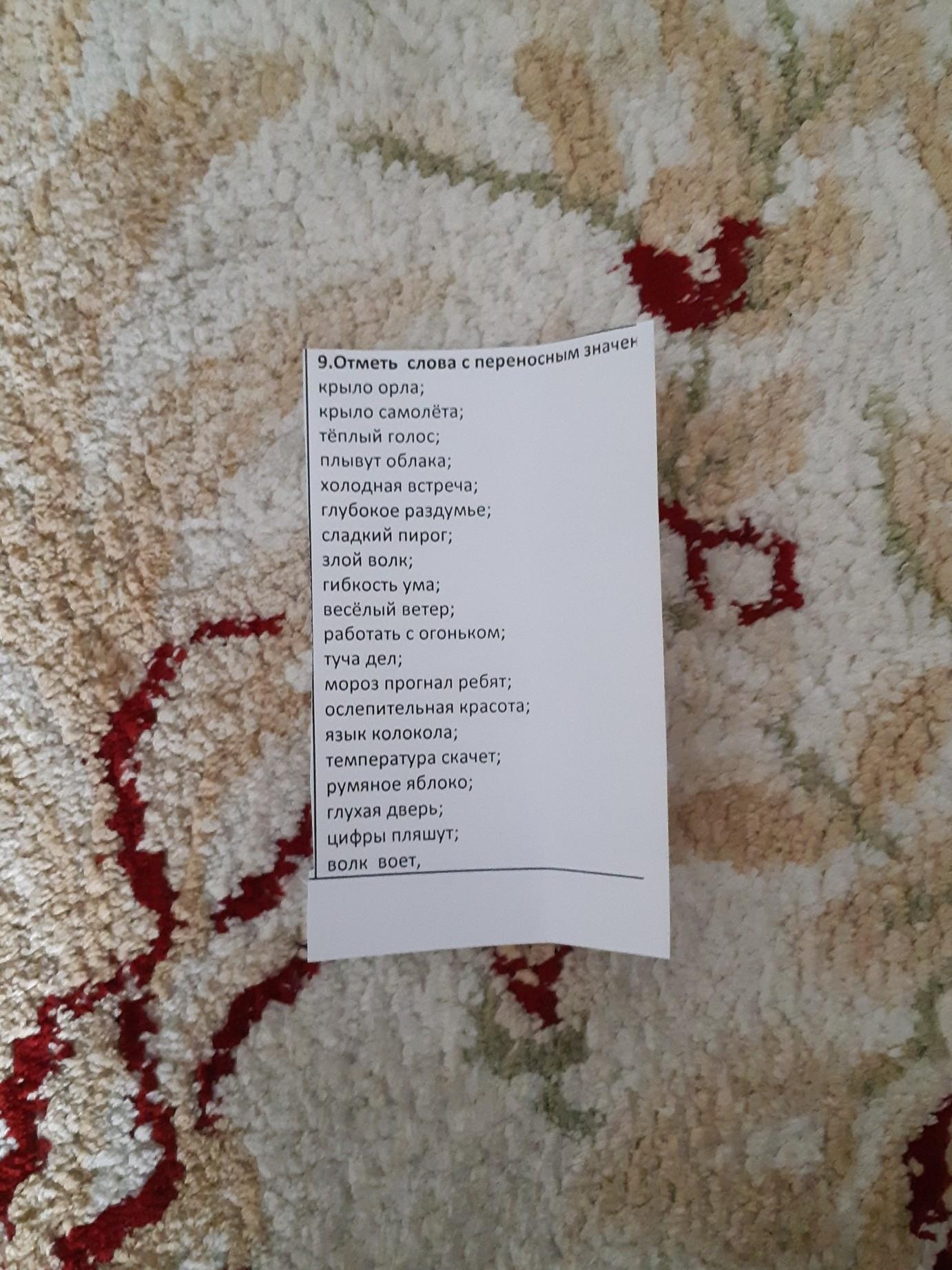 9.Отметь слова с переносным значен крыло орла; крыло самолёта; тёплый голос; плывут облака; холодная встреча; глубокое раздумье; сладкий пирог; злой волк; гибкость ума; весёлый ветер; работать с огоньком; туча дел; мороз прогнал ребят; Ослепительная красота; язык колокола; температура скачет; румяное яблоко; глухая дверь; цифры пляшут; волк воет,