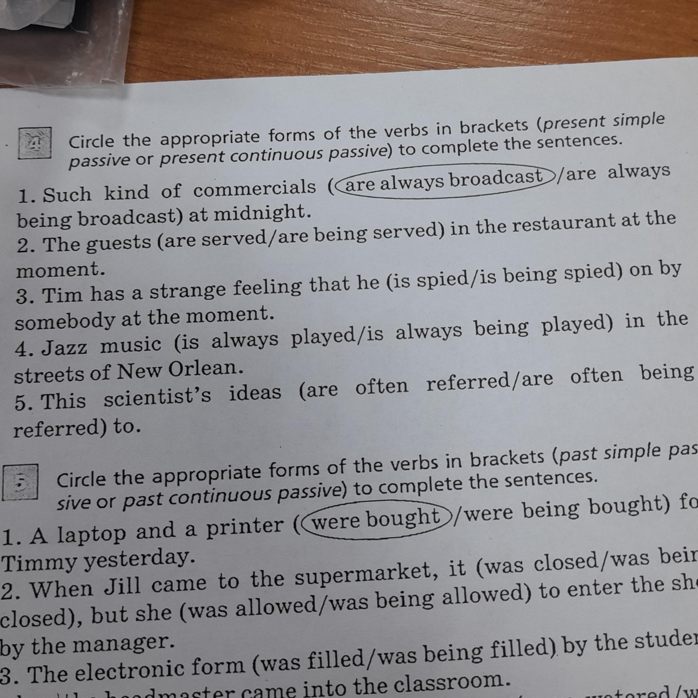 Circle the appropriate forms of the verbs in brackets (present simple passive or present continuous passive) to complete the sentences. 1. Such kind of commercials are always broadcast/are always being broadcast) at midnight. 2. The guests (are served/are being served) in the restaurant at the moment. 3. Tim has a strange feeling that he is spied/is being spied) on by somebody at the moment. 4. Jazz music (is always played/is always being played) in the streets of New Orlean. 5. This scientist's