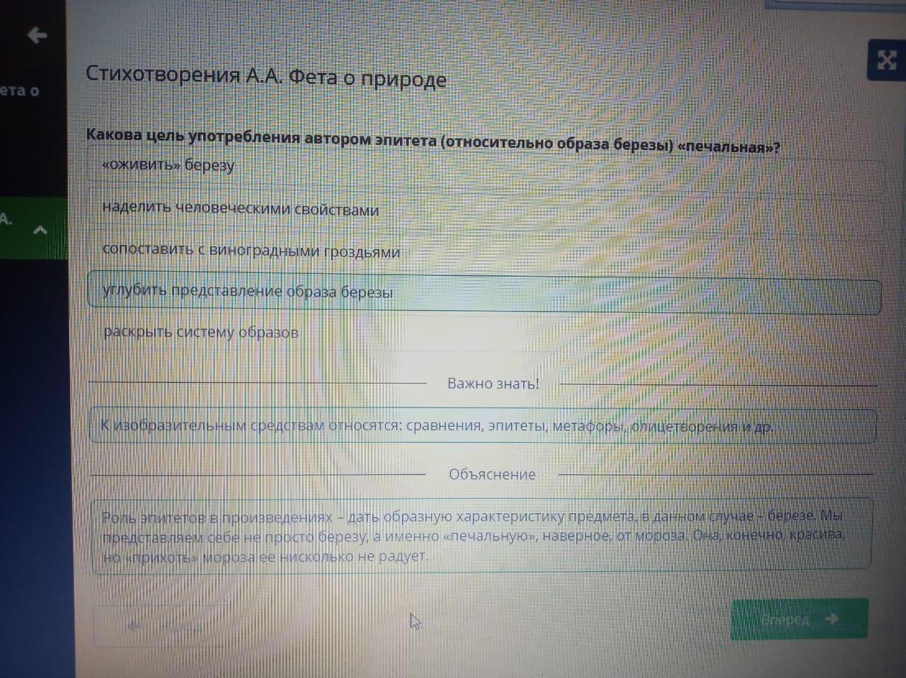 Какова цель употребления автором эпитета (относительно образа березы) «печальная»?