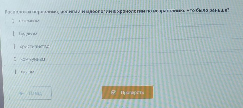 Тотемизм 1791 году, Буддизм возник в середине первого тысячелетия до н.э,Христианство возникло в 33 году нашей эры, в начале VII века в западной Аравии, ну а Коммунизм возник самым последним