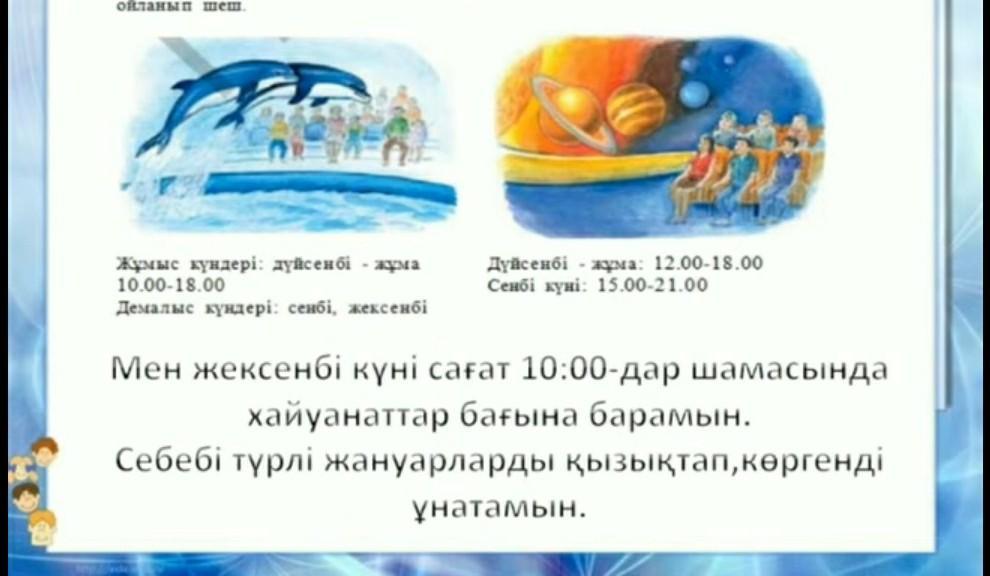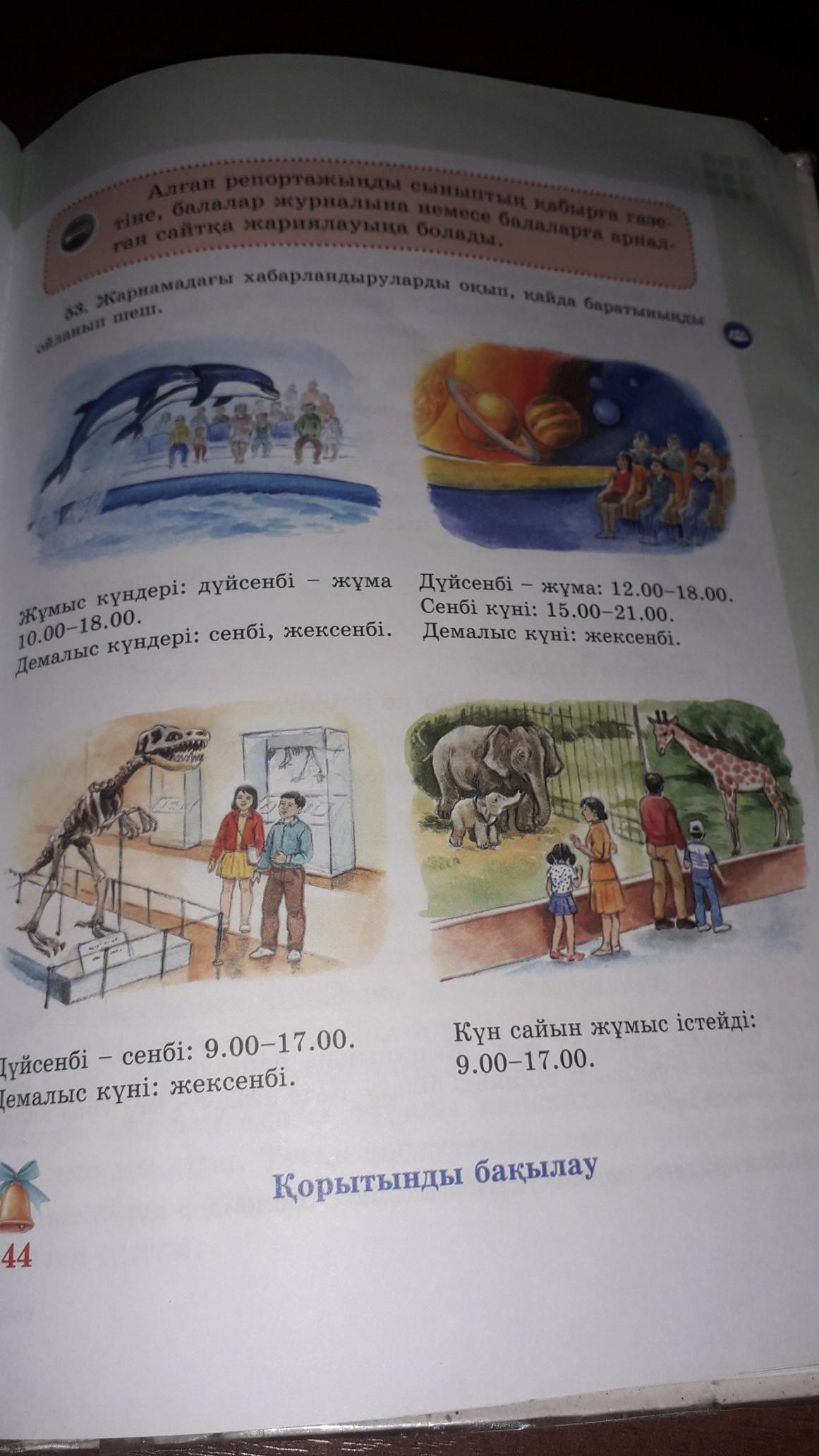 53. Жарнамадағы хабарландыруларды окып, кайда баратында ойланып шеш, Жұмыс күндері: дүйсенбі 10.00-18.00. жұма Демалыс күндері: сенбі, жексенбі. Дүйсенбі – жұма: 12.00-18.00. Сенбі күні: 15.00-21.00. Демалыс күні: жексенбі. Дүйсенбі – сенбі: 9.00-17.00. Демалыс күні: жексенбі. Күн сайын жұмыс істейді: 9.00-17.00.