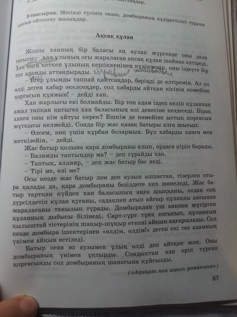 жошы ханның баласы аң аулағанда оны ақсақ құлан шайнап өлтіріп тастайды одан соң жошы халыққа егер оны таппасаңдар онда бәрінді де өлтіреін ал кімде кім оны өлді десе көмеіне қорғасын құямын деген. Сонда ақыры көпшілік ордада отырып, бір домбырашыға күймен айтқызады. Жалпы халық жошыдан қорқып дөрекі сөзбен емес біртіндеп жошыны ашуландырмау үшін соны күймен айтқызады.
