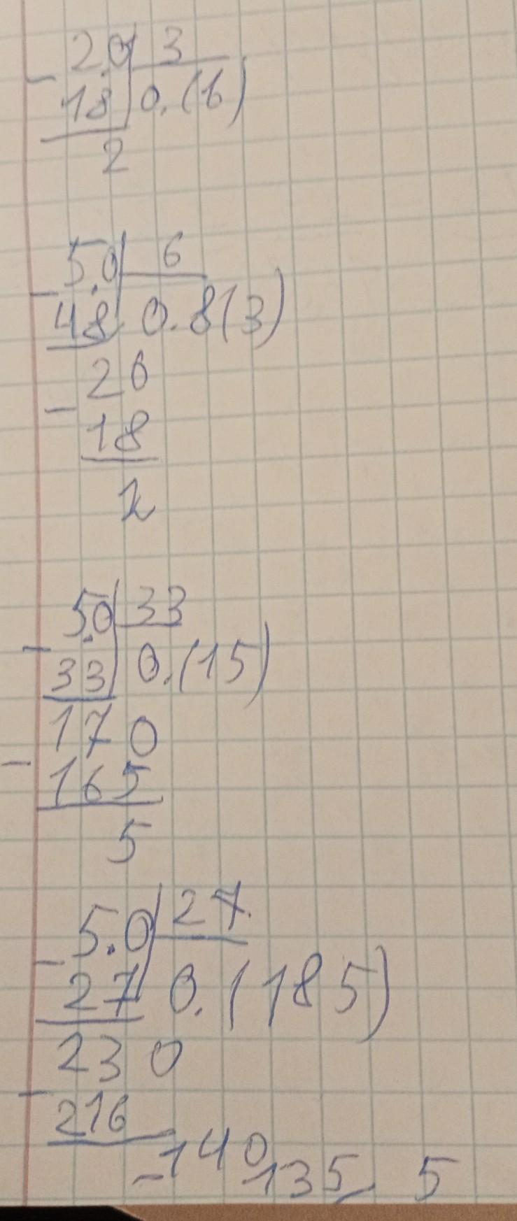 Ок на 1) 2:3=,66...=0,(6) 2)5:6=0,833...=0,8(3) 3)5:33=0,15...=0,15 4) 5:27=0,185...=0,(185)