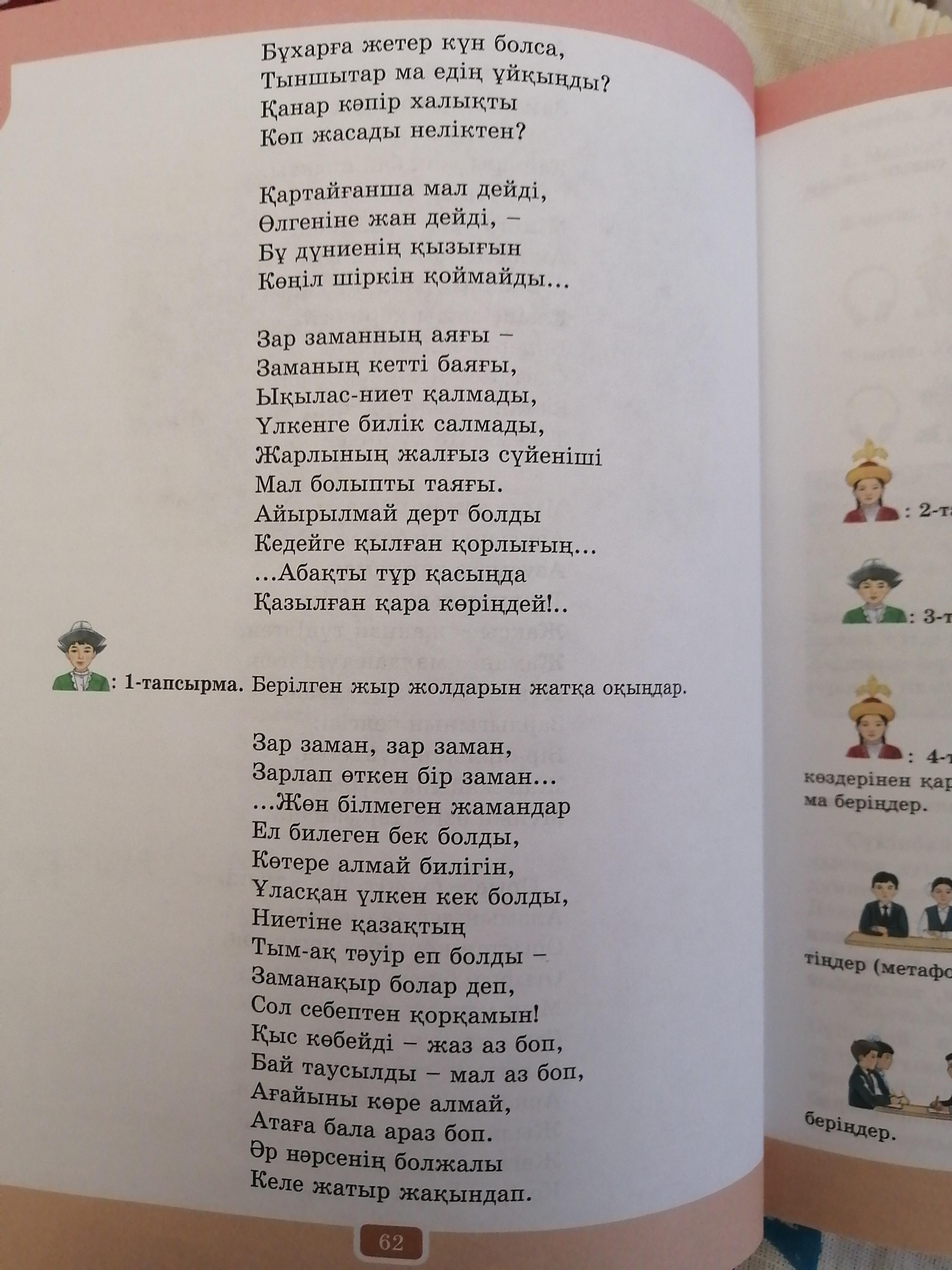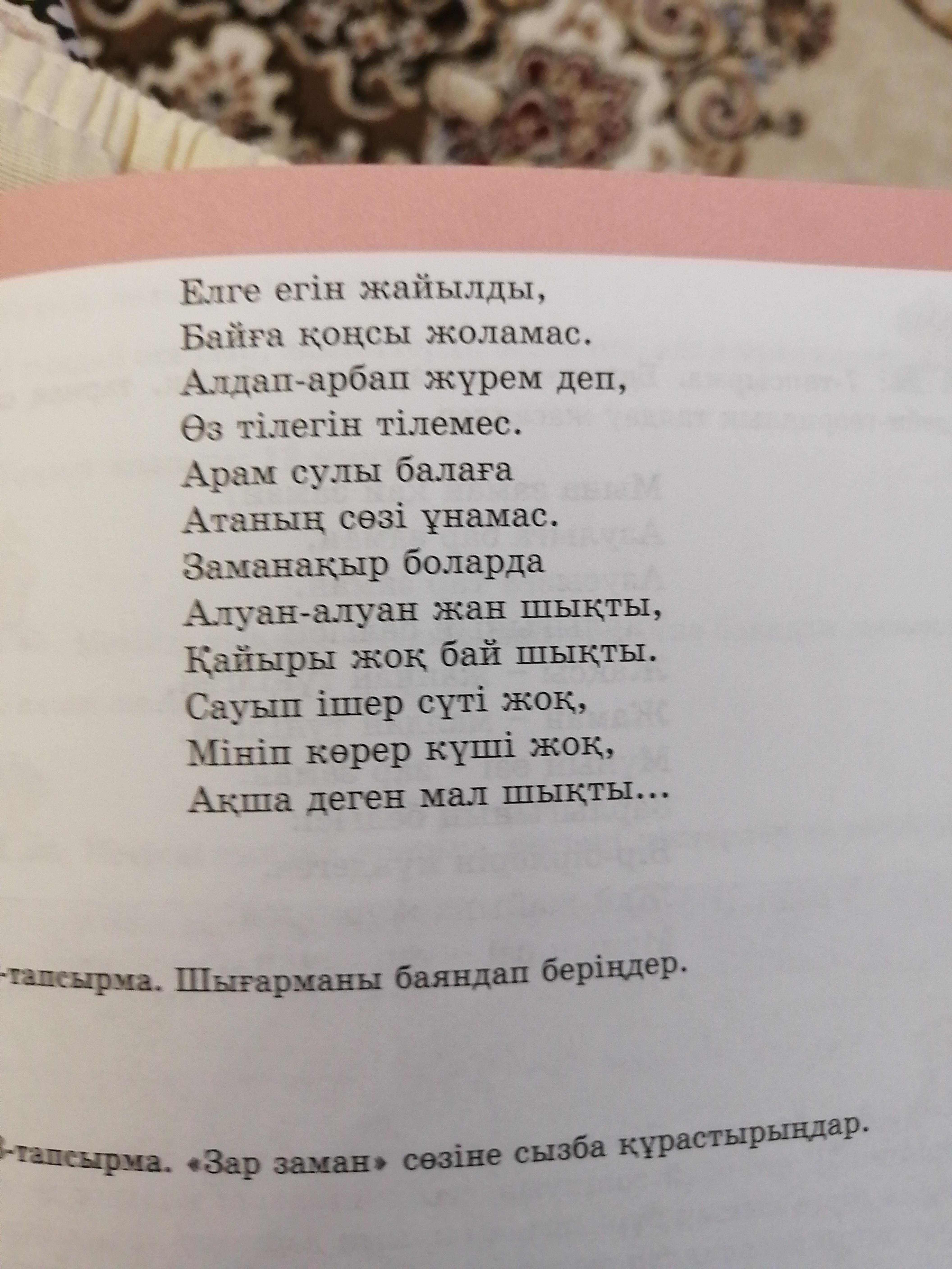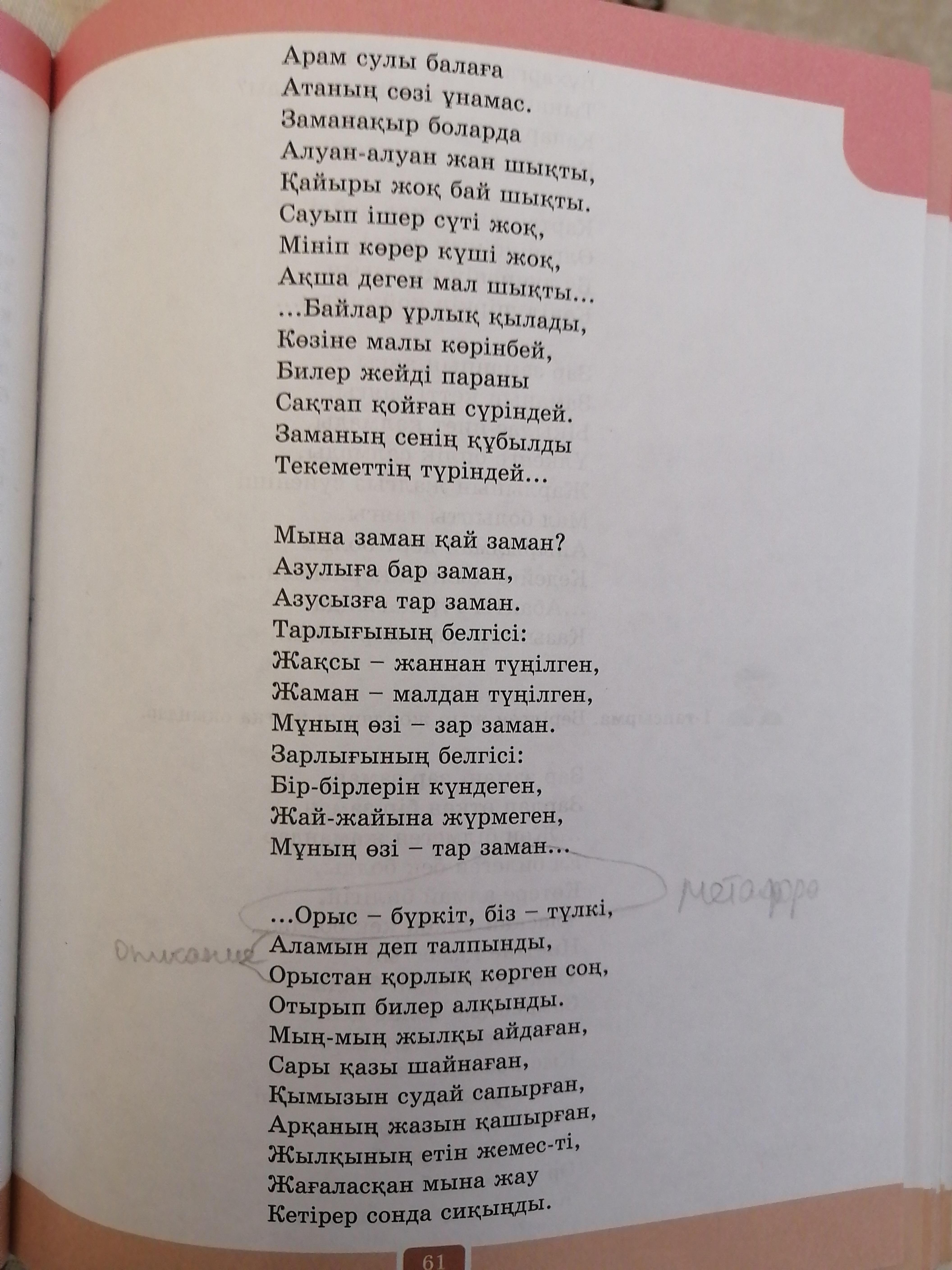 "Зар заман" жырындағы көріктеу құралдарын тауып дәптерге жазыңыз. (Эпифора, анафора, синекдоха, теңеу, ассонанс, аллитерация, метафора т.б)