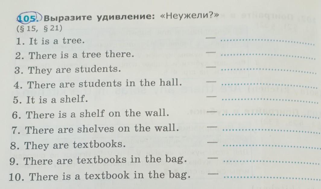 dos выразите удивление: «Неужели?» (5 15, 521) 1. It is a tree. 2. There is a tree there. 3. They are students. 4. There are students in the hall, 5. It is a shelf. 6. There is a shelf on the wall. 7. There are shelves on the wall. 8. They are textbooks. 9. There are textbooks in the bag. 10. There is a textbook in the bag. noun