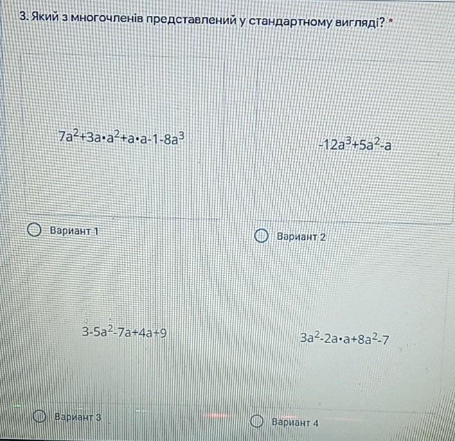 Только в варианте 2 многочлен записан в стандартном виде, т.е. он состоит из суммы одночленов стандартного вида и не содержит подобных членов.