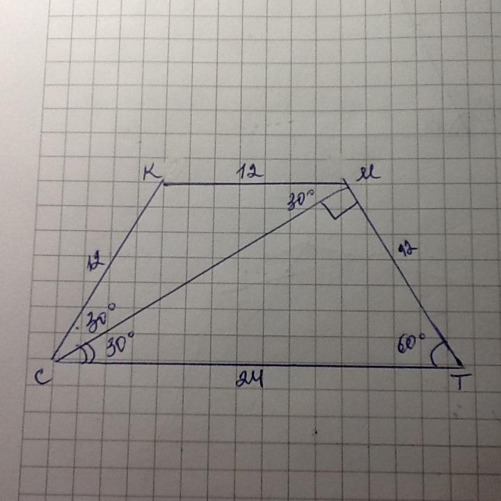 Дано: СКМТ - трапеція, СК=МТ=12 см, ∠КСТ=∠Т=60°. Знайти Р.