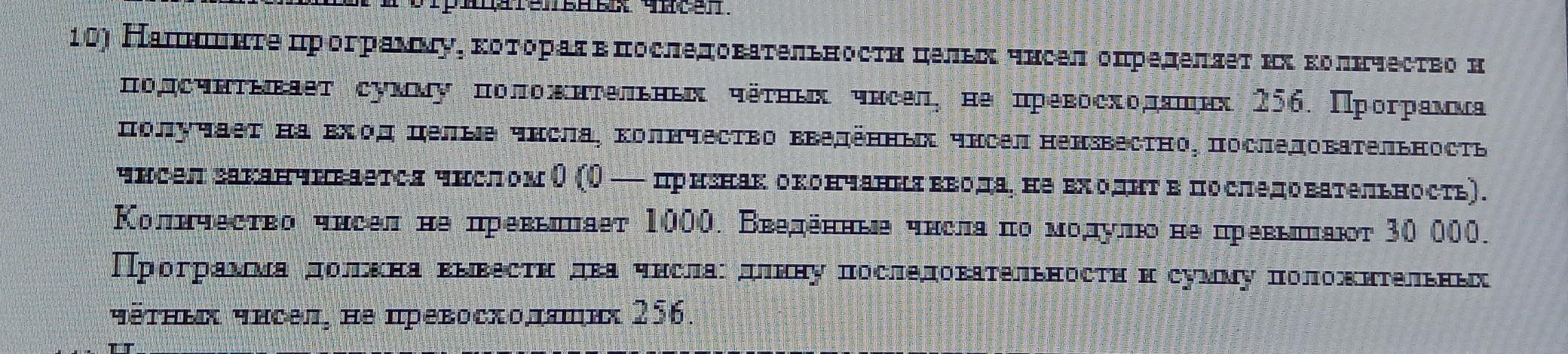 Далее с помощью цикла for перебираем все элементы массива, и благодаря условию if находим среди них элементы значения которых положительны, четны и не больше 256, вычисляем сумму таких элементов. Выводим длину массива и сумму необходимых элементов. В результате получаем следующую программу: