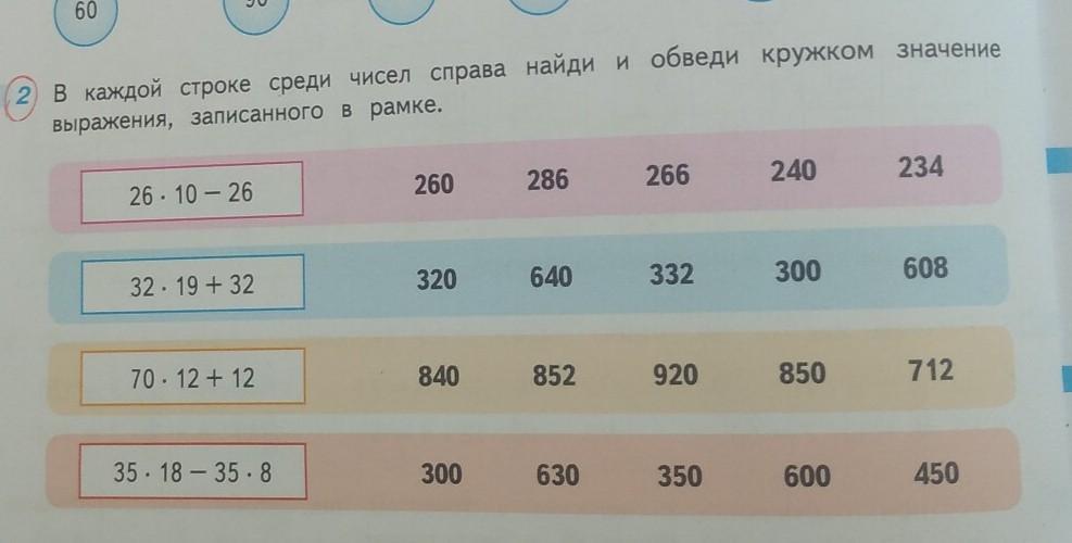 2 В каждой строке среди чисел справа найди и обведи кружком значение выражения, записанного в рамке. 286 260 240 266 234 26 - 10 - 26 640 320 332 300 608 32. 19 + 32 840 852 920 850 70. 12 + 12 712 35. 18 - 35.8 300 630 350 600 450