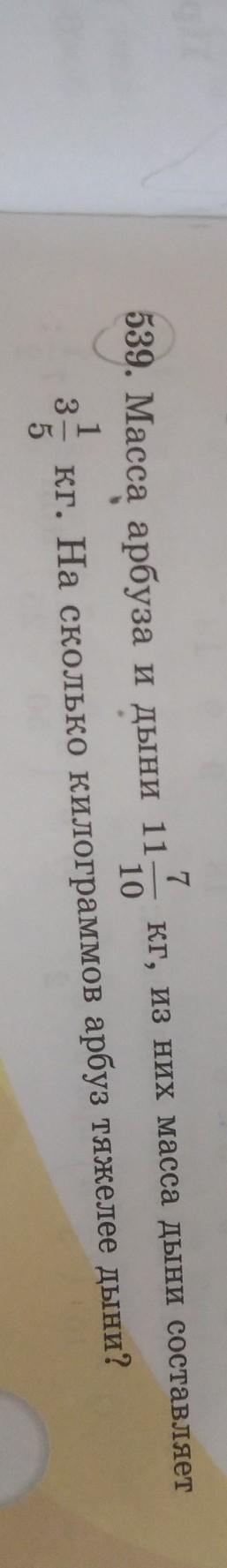 7 539. Масса арбуза и дыни 11 кг, из них масса дыни составляет 10 3 кг. На сколько килограммов арбуз тяжелее дыни? 5