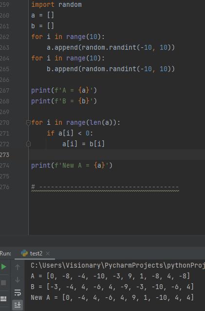 Написать программу, которая: создает два массива (массив A и массив B) из 10 случайных элементов (от -10 до 10), проверяет на знак элементы массива А и в случае, если они отрицательны, заменяет их значениями массива В с тем же номером. Пример: А 9 8 -4 5 3 -2 Б 1 2 3 4 2 9 Результат: А 9 8 3 5 3 9