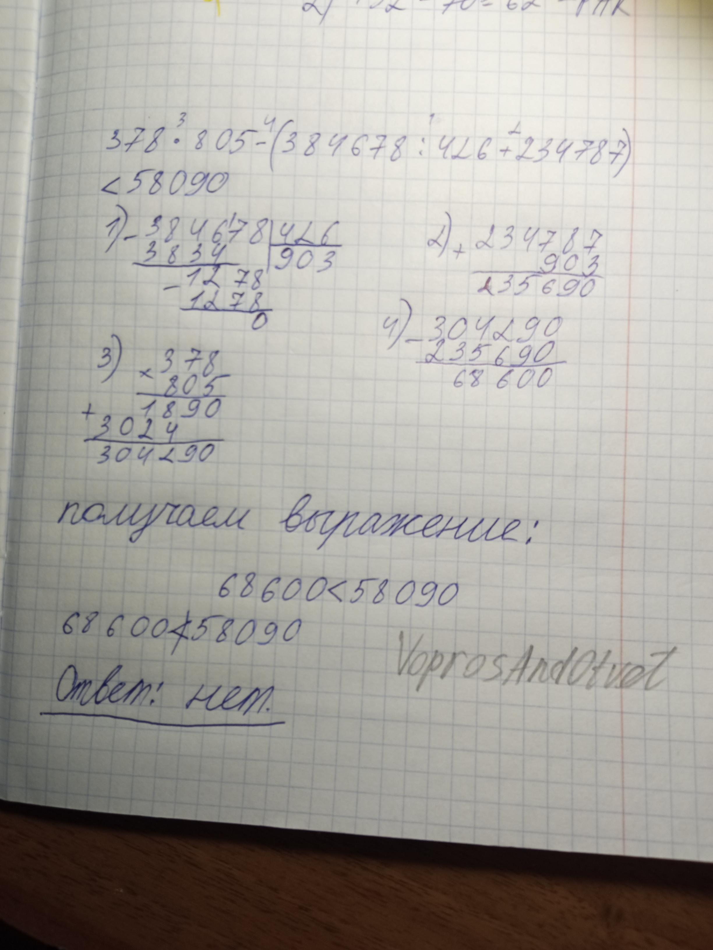 Верно ли высказывание: да, нет 378 · 805 - (384 678 : 426 + 234 787) < 58 090