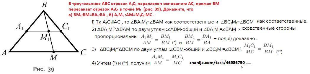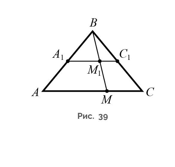 В треугольнике ABC отрезок A₁С₁ параллелен основанию AC, прямая BM пересекает отрезок А₁С₁ в точке М₁ (рис. 39). Докажите, что