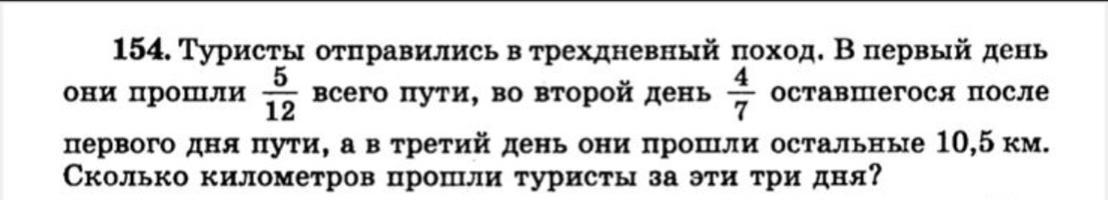 24,5 : ( 1 - 5/12) = 24,5 : 7/12 = 24,5 * 12/7 = 42 км прошли туристы за три дня
