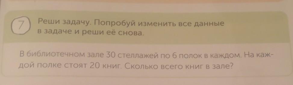 Реши задачу. Попробуй изменить все данные в задаче и реши ее снова. В библиотечном зале 30 стеллажей по болок в каждом. На каж- дой полке стоят 20 книг. Сколько всего книг в зале?