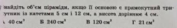 Знайдіть обєм піраміди, якщо її основою є прямокутний трикутник із катетами 5см і 12см, а висота дорівнює 4см.