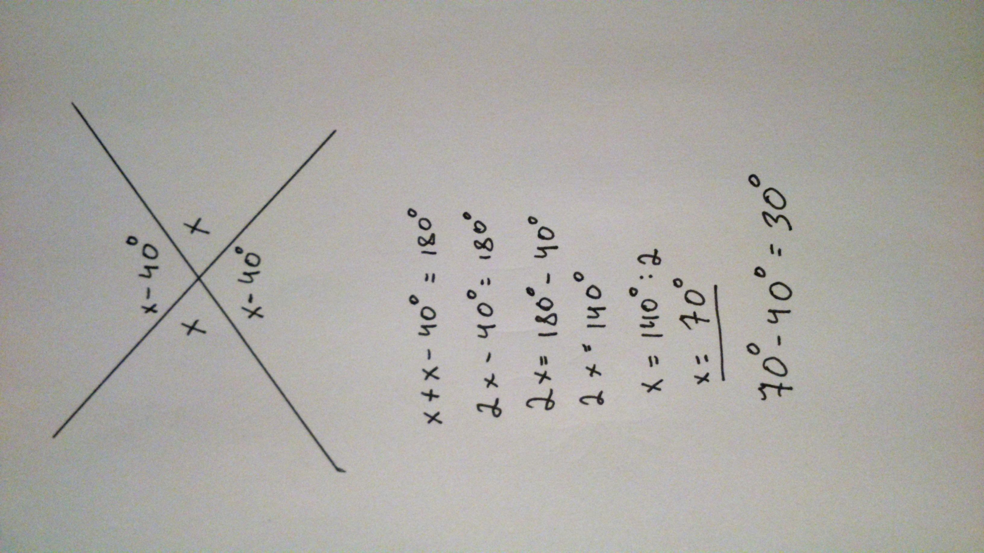 Один из углов полученных при пересечении 2 прямых на 40 градусов меньше другого. Найти каждый из полученных углов. СРОЧНО ПОМОГИТЕ ПОЖАЛУЙСТА!!!ОТДАМ 50 БАЛЛОВ!!