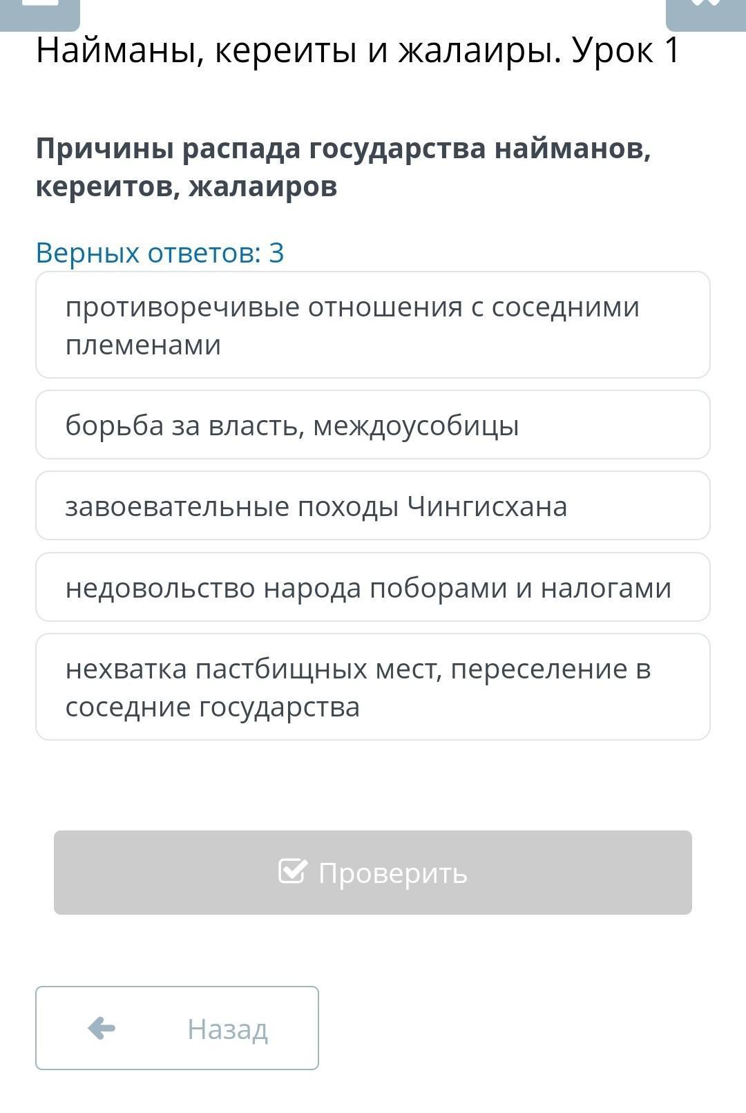 Есть несколько причин распада государства найманов, кереитов и жалаиров в начале Х||| века: борьба за власть, междоусобицы, противоречивые отношения с соседними племенами, с которыми они то воевали, то имели дружественные отношения и завоевательные походы Чингисхана.