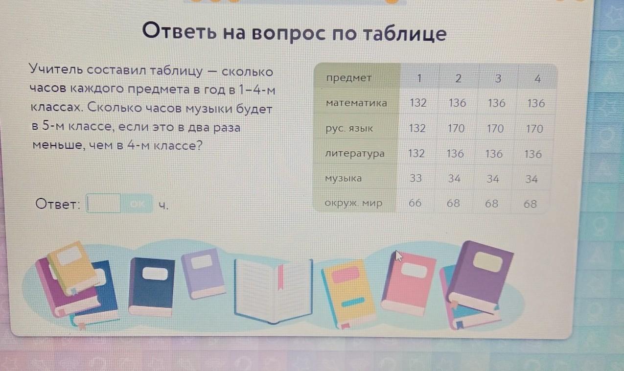 т.к. в два раза меньше, чем в 4 классе, а в 4 классе 34 часа, значит 34 делим на 2 и получаем 17.