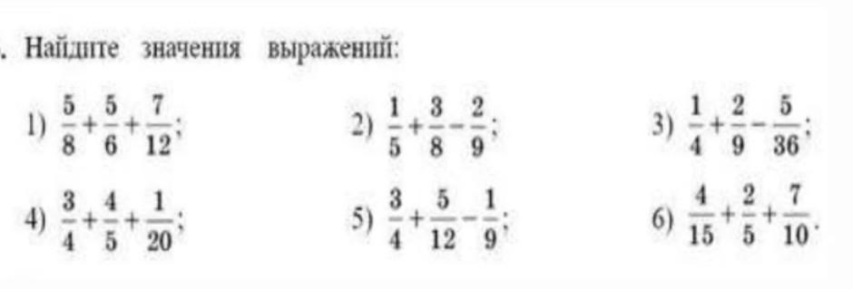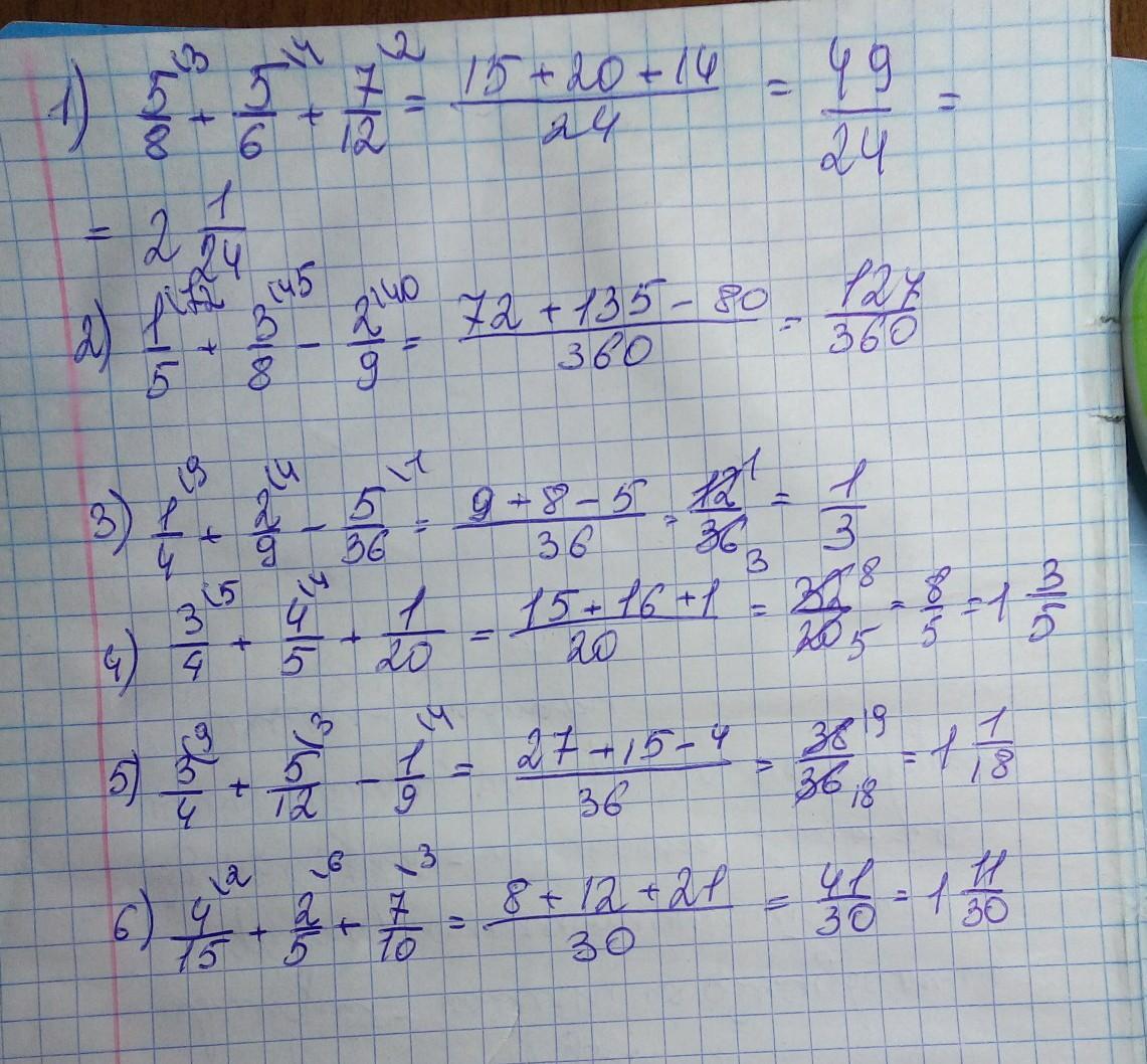 4/15+2/5+7/10= 1/4+2/9-5/36= 3/4+4/5+1/20= 1/5+3/8-2/9= 5/8+5/6+7/12=