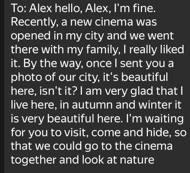 привет, Алекс, у меня все хорошо. Недавно у меня в городе открыли новый кинотеатр и мы ходили туда с семьей, мне очень понравилось. Кстати, когда то я отправлял тебе фото нашего города, тут красиво, правда? Я очень рад что живу здесь, осенью и зимой здесь очень красиво. Я жду тебя в гости, приезжай скроее, что бы мы вместе сходили в кино и посмотрели на природу