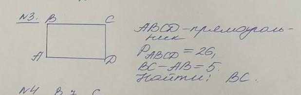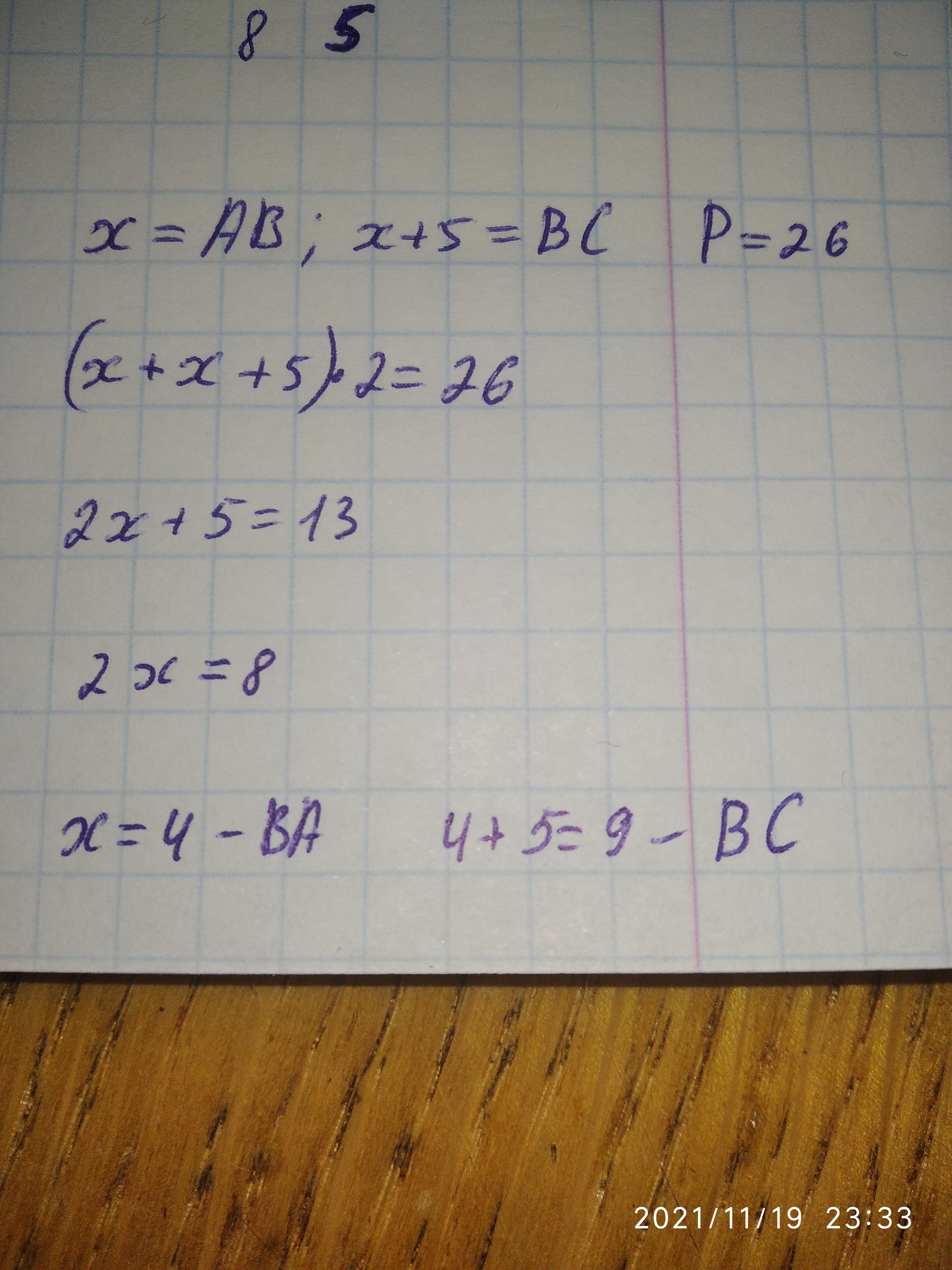 AB=X ; BC = X+5 ; (x+x+5)*2=26 ; 2x+5 = 13 ; 2x = 8 ; x = 4 ;; 4+5=9/